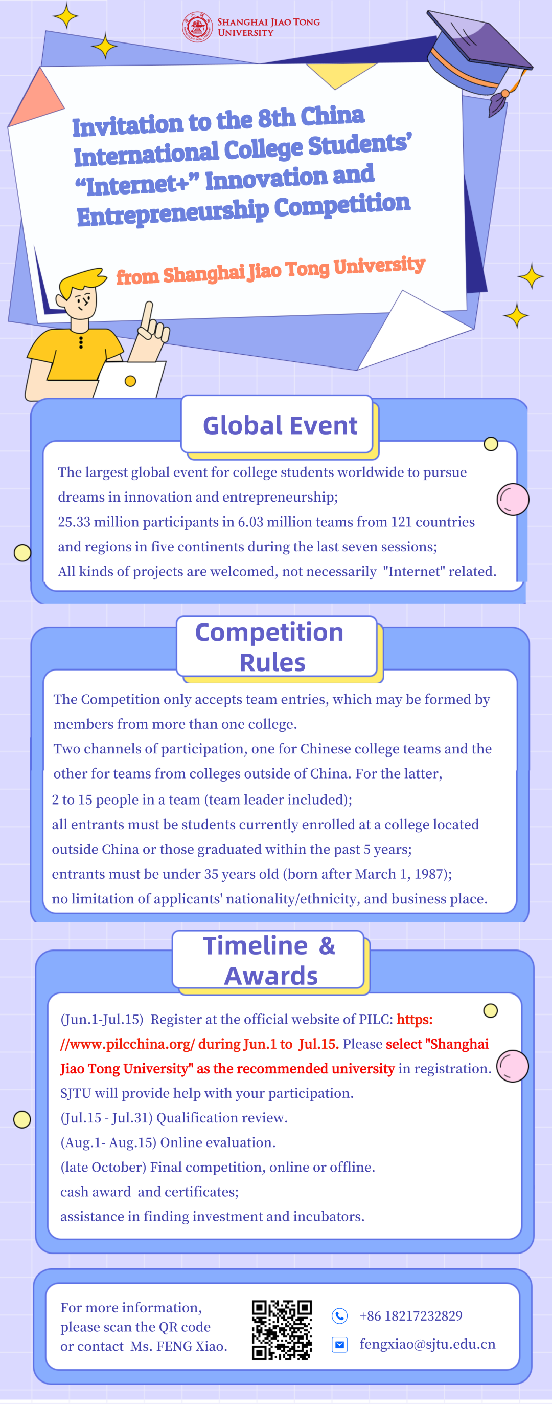 Commissioned by the Organizing Committee of the Competition, Shanghai Jiao Tong University is inviting excellent young people engaged in innovation and entrepreneurship all over the world to this event where entrants can work to realize the dream of innovation and entrepreneurship, and to create a better future for the world.