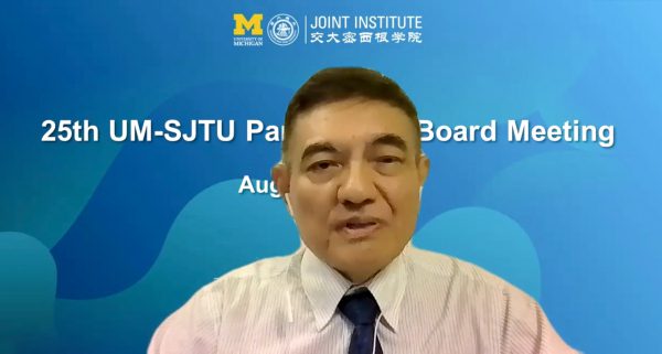 The University of Michigan (UM) – Shanghai Jiao Tong University (SJTU) Partnership Board held its 25th meeting on August 25 via simultaneous videoconference in China and the United States. Board members from the two universities attended the meeting presided by SJTU President Kuiling Ding.