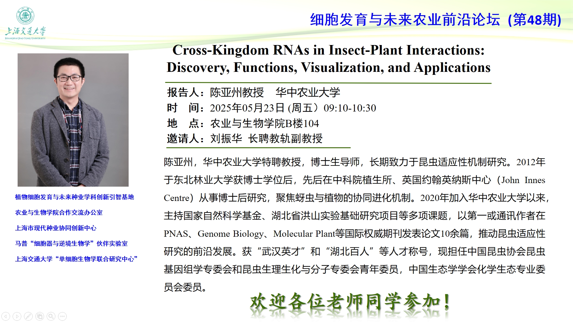 【细胞发育与未来农业前沿论坛第48期】Cross-Kingdom RNAs in Insect-Plant Interactions: Discovery, Functions, Visualization, and Applications