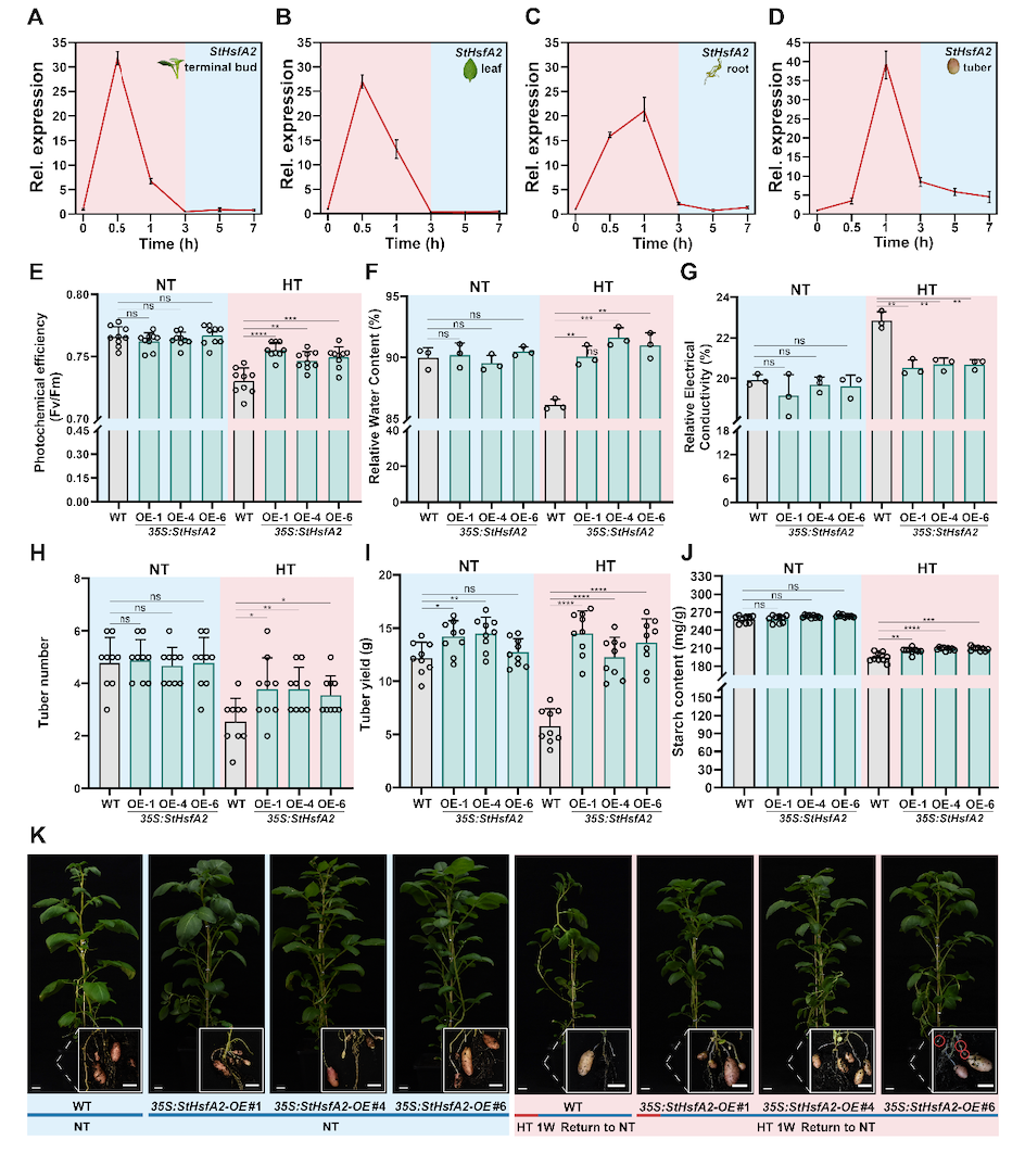 作者首先利用不同时长的高温处理,确定了有效的高温处理时长。研究表明高温处理时间越长,对马铃薯块茎化的抑制作用越强,一周高温就足以抑制块茎发育。为了确定马铃薯植株热激反应(HSR)中涉及的关键HSF基因,作者检测了马铃薯中几种主要的A型HSF基因在高温下的响应,结果表明StHsfA2响应最为剧烈,提示其在马铃薯抵御高温中可能具有重要功能。接下来,作者构建了马铃薯StHsfA2过表达材料;观察发现,过表达StHsfA2赋予了马铃薯显著的耐热性,且叶片相对电导率等生理指标测定结果表明StHsfA2转基因植株在高温下能保持较好的生理状态。在高温结束后的恢复生长阶段,StHsfA2过表达植株相较于野生型植株而言,其生长状态能迅速恢复,并且具有更高的块茎产量。总的来说,过表达StHsfA2赋予马铃薯耐热性,使其在高温下能维持较高的块茎产量。