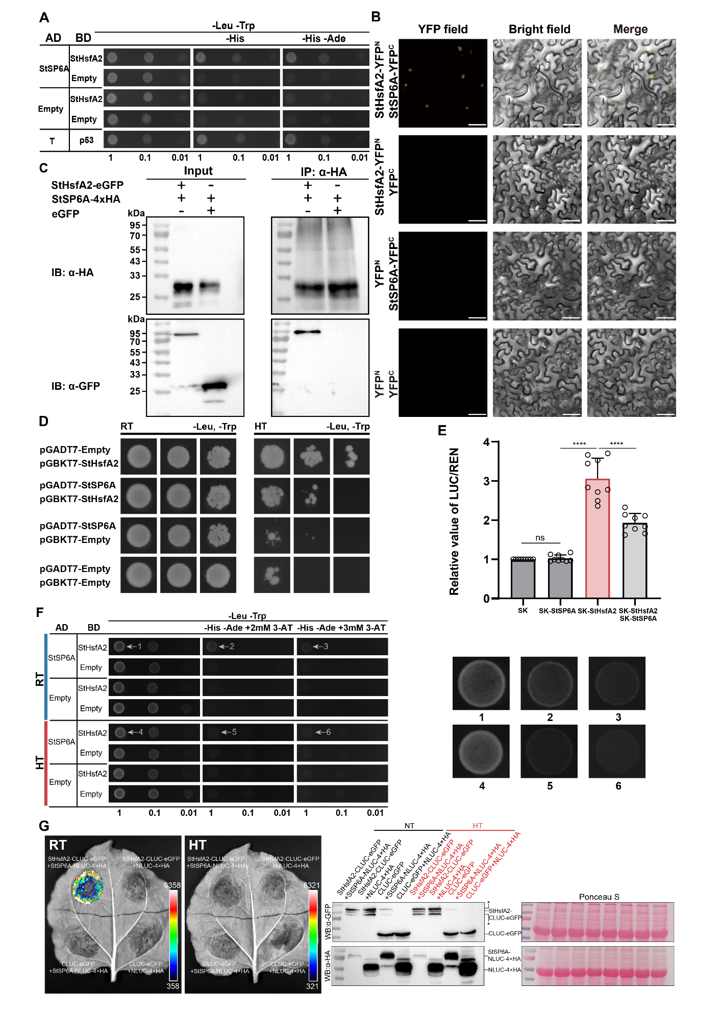 图1 StHsfA2与StSP6A相互作用,这种相互作用在高温下减弱